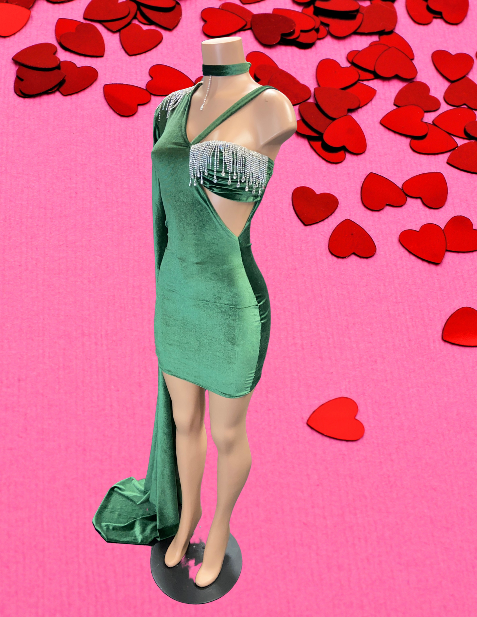This dress is a one sleeve velour beauty with a side train complete with a shell cup & diamonds to bring out the royalty in the look . Super cute for Valentine’s Day or any nice occasion!